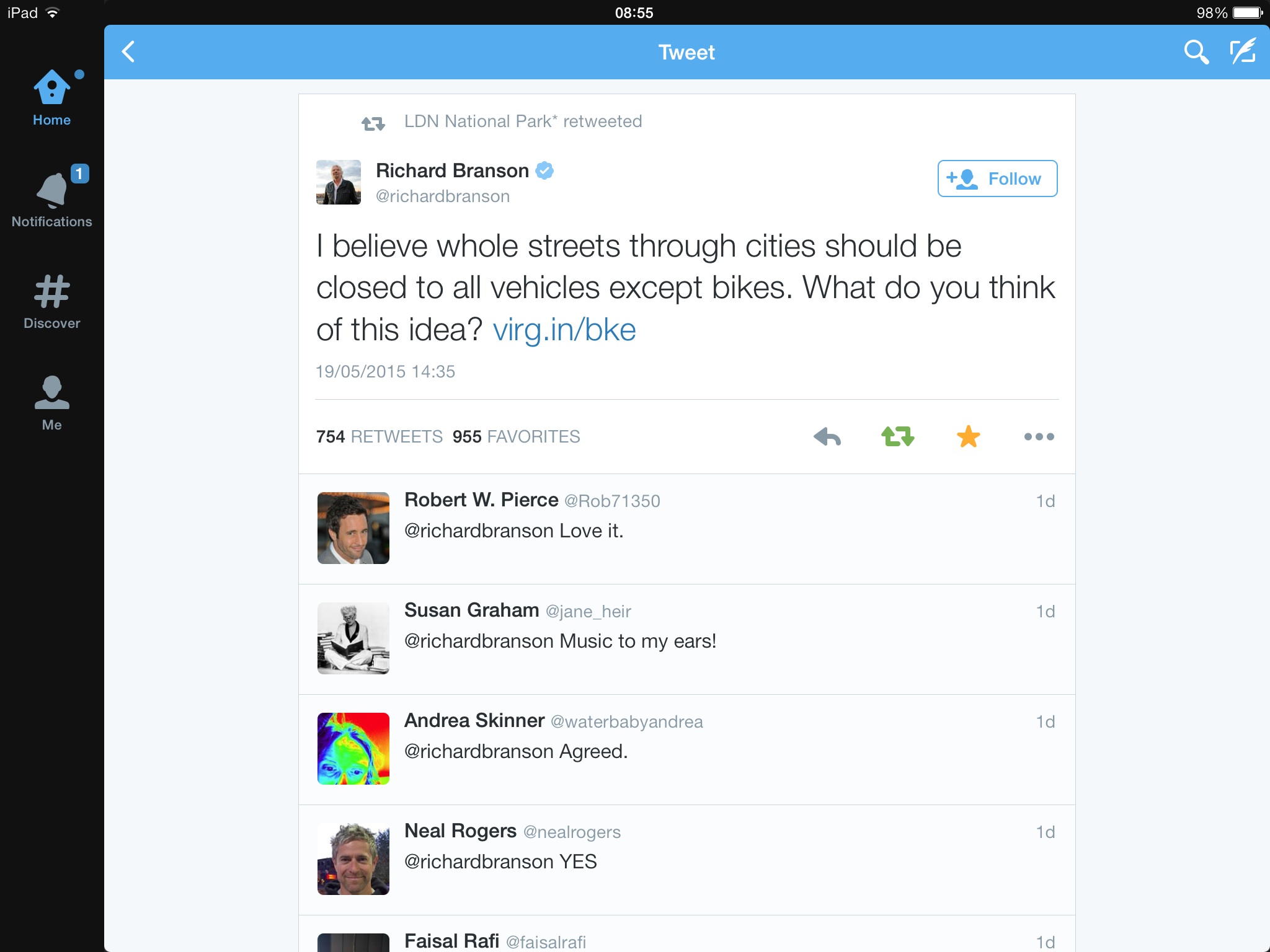 Image Richard Branson – I believe whole streets through cities should be closed to all vehicles except bikes. What do you think of this idea? 21 Thursday May 2015 Posted by vreadhead in Uncategorized ≈ Leave a comment Share this: Click to share on X (Opens in new window) X Click to share on Facebook (Opens in new window) Facebook Like Loading... Related