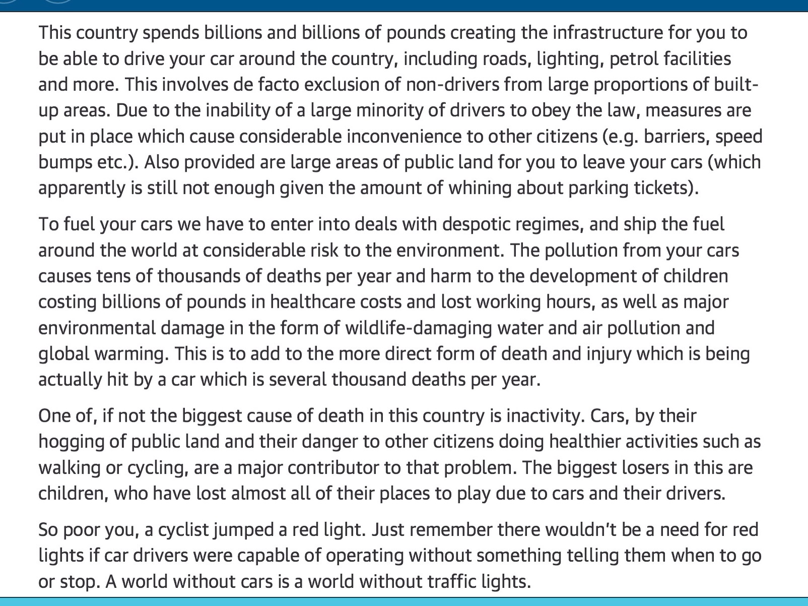 Brilliant rant on comment section of Peter Walker’s article in The Guardian about the BBC and Cyclists 17 Friday Jul 2015 Posted by vreadhead in Uncategorized ≈ Leave a comment http://www.theguardian.com/environment/bike-blog/2015/jul/17/the-bbc-has-a-problem-with-cyclists-and-it-doesnt-want-to-talk-about-it Share this: Click to share on X (Opens in new window) X Click to share on Facebook (Opens in new window) Facebook Like Loading... Related